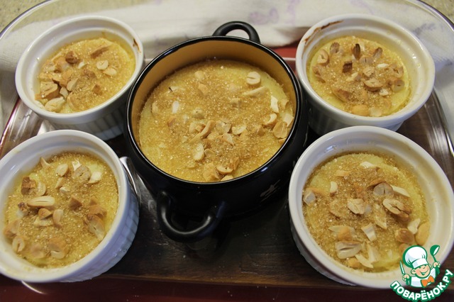 Достаем из духовки и сразу же посыпаем сверху коричневым сахаром, он придаст пудингу легкую карамельную нотку.