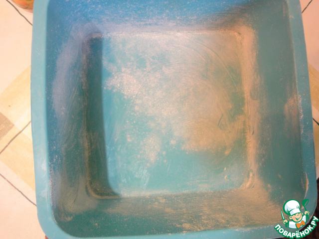 Духовку разогреваем до 180 градусов. Форму для запекания (у меня квадратная 18х18) смазываем сливочным маслом и присыпаем мукой.