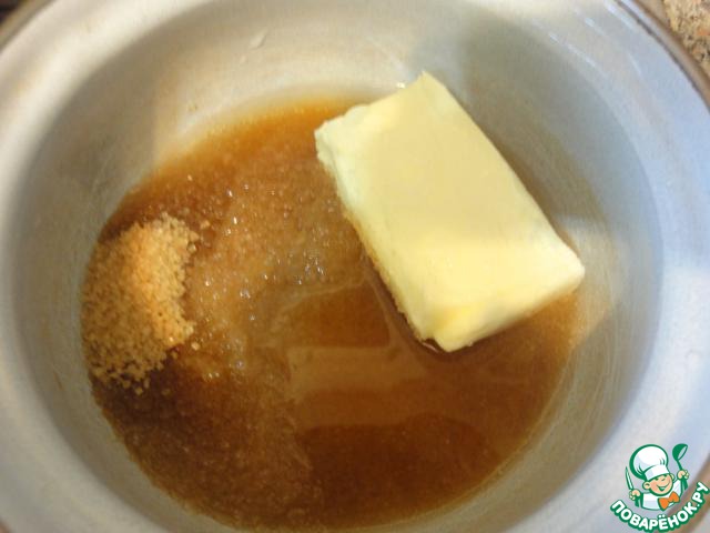 Для этого в небольшой кастрюльке растапливаем оставшиеся 100 грамм масла с оставшейся частью сахара (примерно 2/3 cтакана) и 1/3 стакана воды.