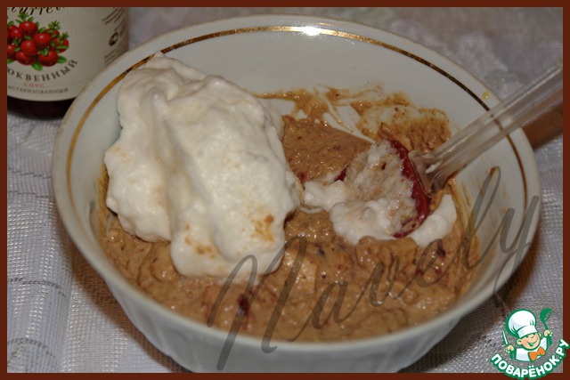 Приготовим соус для подачи. Для это смешаем 2 столовые ложки сметаны с 1 столовой ложкой клюквенного соуса.