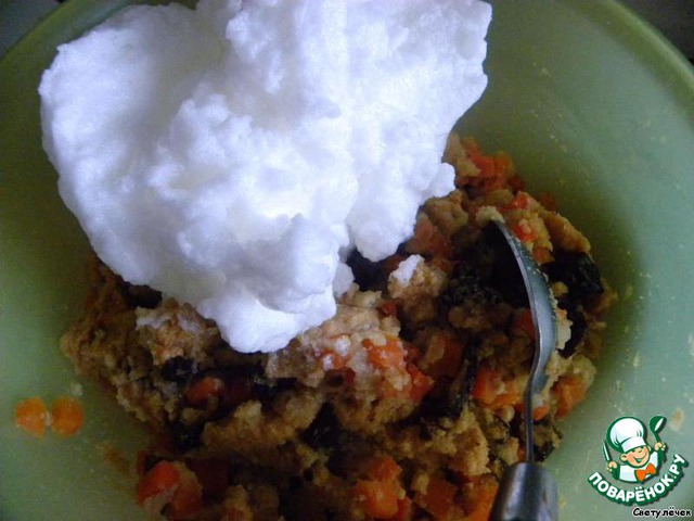 Яичные желтки растереть с сахаром, соединить с морковью, яблоками, ложкой кедровых орешков, сухарями, корицей и черносливом.