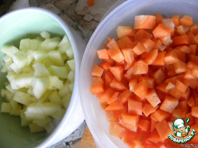 Морковь и яблоко нарезать кубиками и припустить в молоке.