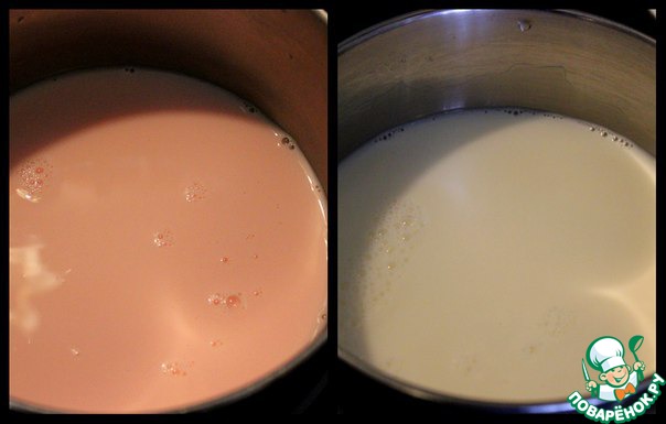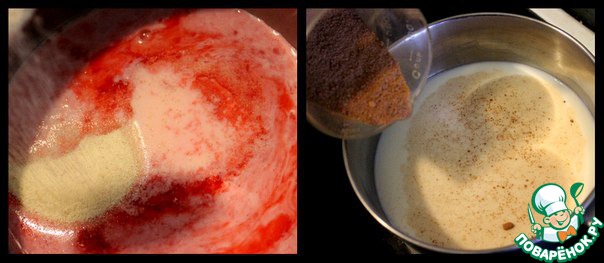 Высыпаем смешанную манку в молоко. Манку с сахаром в клубничное молоко, а манку с какао в простое молоко.