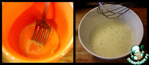 Взбиваем отдельно желтки и белки. Белки взбиваем до пенообразного состояния. Если хотите десерт послаще, то желток взбить еще с ложкой сахара на свое усмотрение.