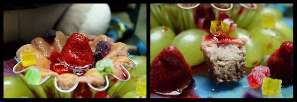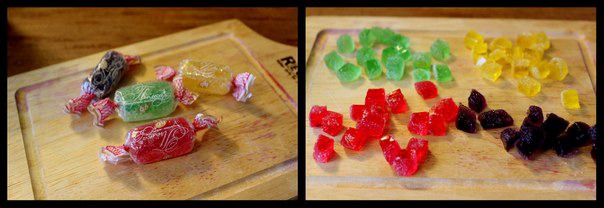 В это время готовим мармеладное украшение. Я взяла несколько конфет и порезала кубиками. Чтобы расцепить слипшиеся кусочки, нужно руки смочить в водичке.