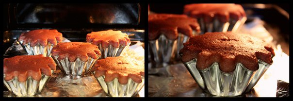 Выкладываем в формочки сначала шоколадный слой, потом клубничный. И ставим запекаться в уже разогретой духовке. Выпекаем до сухой зубочистки. У меня на это ушло минут 30.