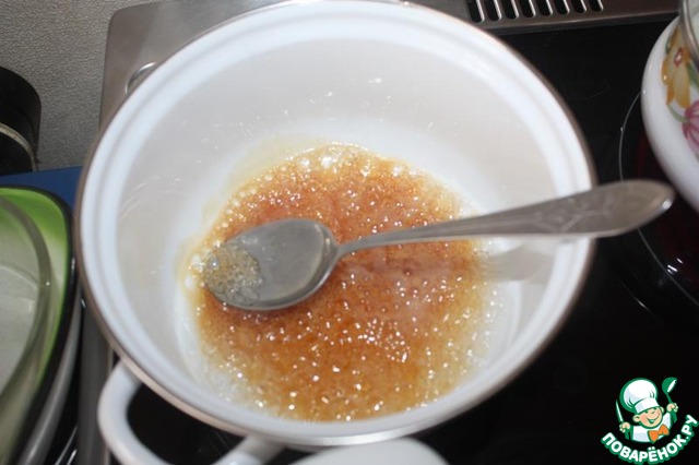 50 г сахара смешать с водой и варить карамель до коричневого цвета