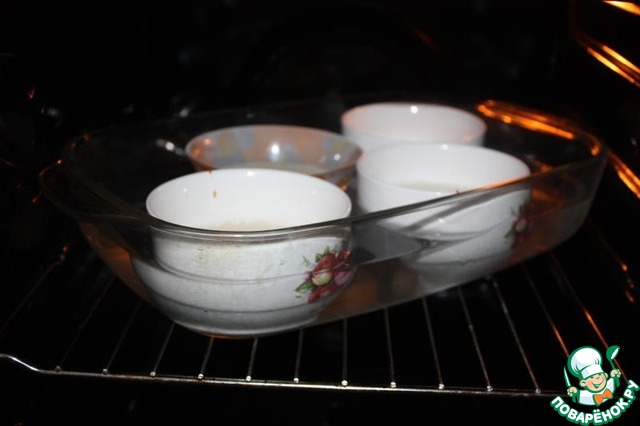 Поставить формы в клубокий противень, налить в него воды до уровня молочно-яичной смеси. Разогреть духовку до температуры 180 градусов. Запекать 30 минут