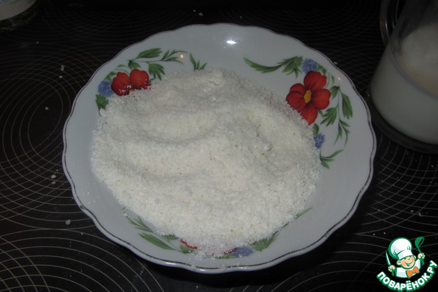 Рис промываем, даем высохнуть и измельчаем в кофемолке, не очень мелко.