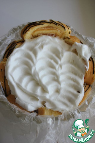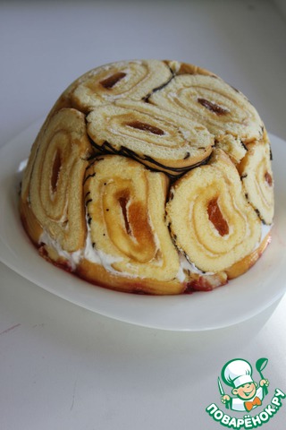 Затем ломтики рулета распределите по форме, чтобы они плотно прилегали друг к другу. Оставшиеся промежутки заложите кусочками бисквита.