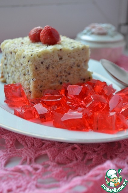 Разлить желе в плоское блюдо, убрать в холодильник. Когда хоршо застынет разрезать на маленькие квадратики и подать вместе с пудингом. Приятного аппетита!