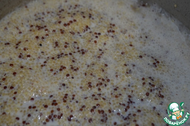 Заливаем крупу молоком и варим до готовности (молоко должно полностью впитаться), добавляем соль, сахар, сливочное масло.