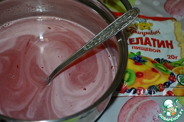 Желатин замочить 1 стак. хол. кипяченой воды, через 30 мин. нагреть, не доводя до кипения и добавить его в сок.