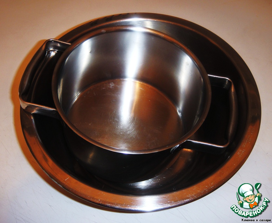 Нам потребуются две глубокие посуды (мисочки или кастрюльки). Одна — большая, другая — маленькая и обязательно огнеупорная. Маленькая должна свободно помещаться в большую.