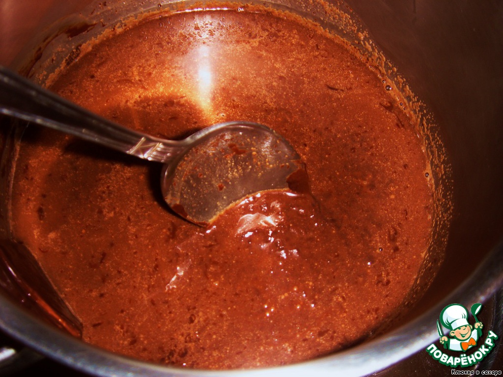 Ставим кастрюльку на плиту и нагреваем на небольшом огне. Ничего не должно кипеть, а только медленно плавиться. Выключаем огонь, как только шоколад полностью растворился и оставляем на горячей плите, чтобы шоколадная масса ни в коем случае не остыла.