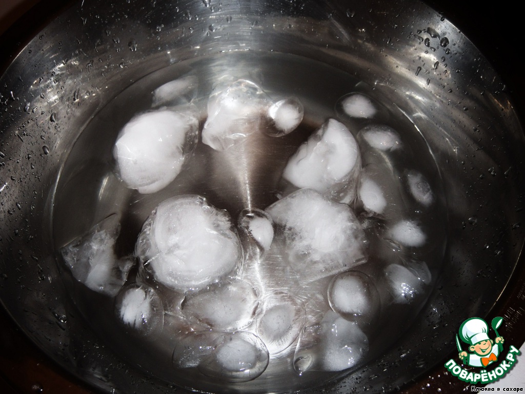В большую посуду наливаем очень холодную воду и кидаем в неё лёд.