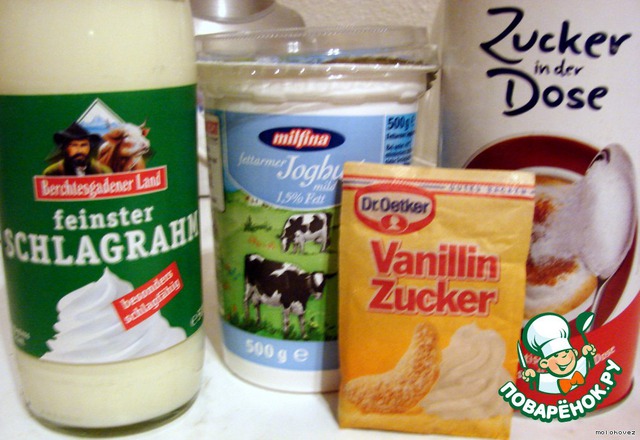 Нужно было взбивать йогурт, сахарный песок, ванильный сахар до тех пор, пока сахар практически не растворится. Потом в отдельной посуде хорошенько взбить сливки.