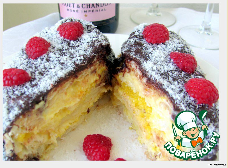 У меня нашлись вот такие изделия из слоеного теста, ананас и шоколад. И еще кокосовая стружка.
