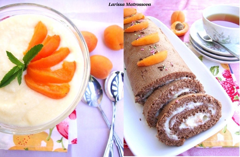 По желанию, можно добавить какие-нибудь фрукты. У меня были абрикосы, которые я выложила на край бисквита, с которого начинаем заворачивать рулет, они окажутся в центре.