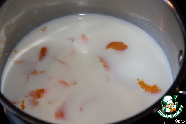 Положить апельсиновые корочки в молоко и, как только начинает закипать, снять с огня. Не кипятить! Дать молоку настояться и немного охладить.