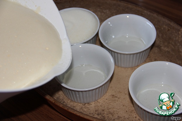 Приготовленную карамель быстро разлить по формочкам. Сверху вылить приготовленный крем. Если у вас во время взбивания образовалась пена, тогда надо, чтобы, когда выливаете крем в формочки, была как бы шапочка и довольно высокая. Шапочка потом осядет в духовке.