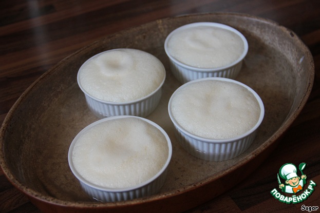 Формочки поставить в большую форму, напонить ее на 3/4 водой.