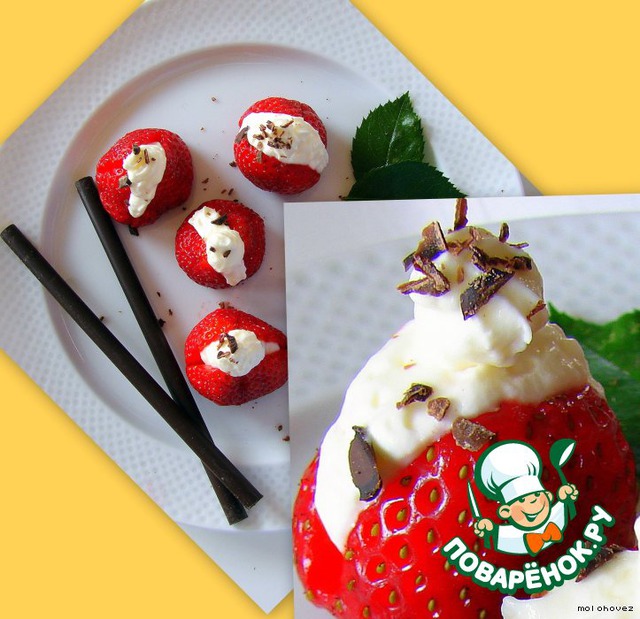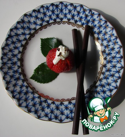 Крупную клубнику надрезать крест-накрест, почти до основания. Подрезать плодоножку, чтобы ягоду можно было поставить на блюдо!
