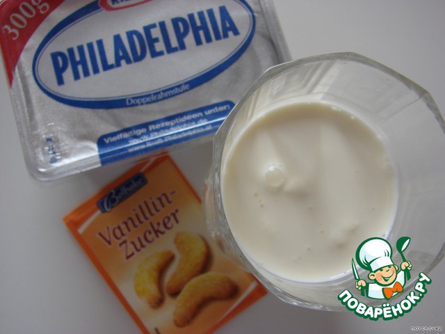 Взбить сливки, добавить ванильный сахар, сыр типа "Филадельфия" или творог. Взбить все вместе. Было бы неплохо добавить закрепитель для сливок.