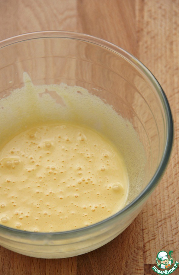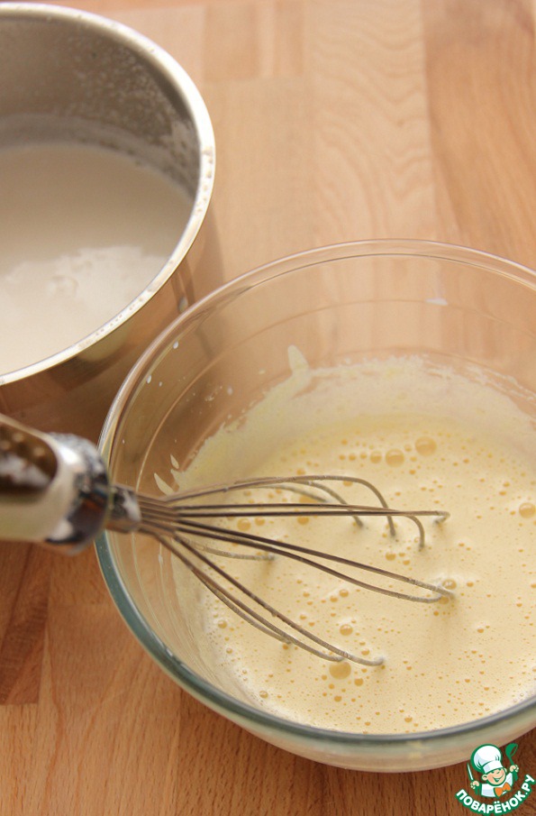 Затем "закалить" желтки. Т. е. влить небольшое кол-во горячего молока в желтки, тщательно размешать и затем влить оставшееся молоко.