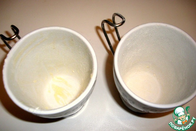 Формочки (у меня обыкновенные керамические кружки) смазать маслом и припудрить мукой. Включить разогреваться духовку при 210 гр.