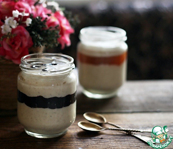 Выложить слоями в порционные формочки, сначала заполнить половину, сверху топпинг (у меня яблочное повидло и шоколад).