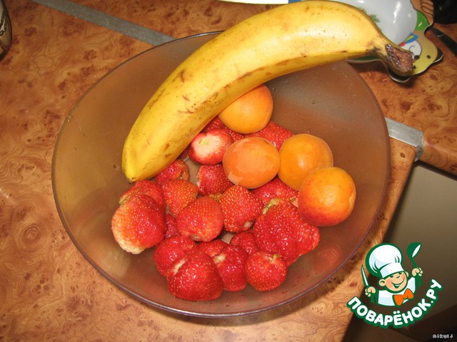 Назвала этот десерт загадкой по той причине, что никогда не знаю с чем сделаю его в следующий раз, а это самый частый круглогодичный десерт в нашей семье. Сегодня использовала клубнику, абрикосы, банан. Все нарезать небольшими дольками.