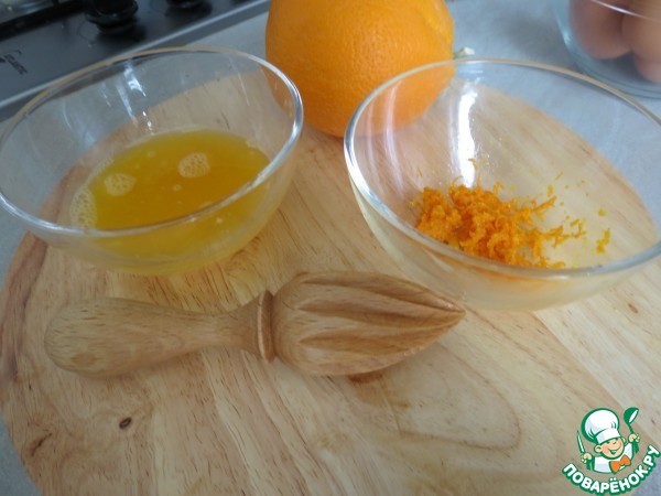 добавить цедру, сок апельсина и тёплое молоко, перемешать.