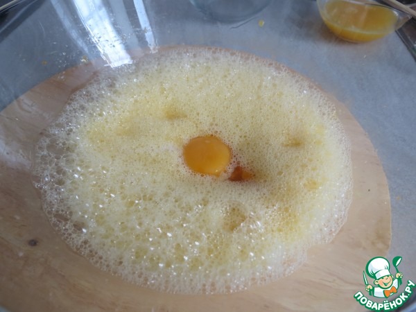 яйца взбить до однородной массы, добавить сахар / 80 г. / и желтки.
