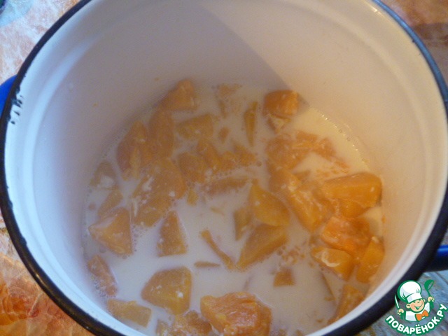 Очищенную тыкву порезать на кусочки и залить молоком.