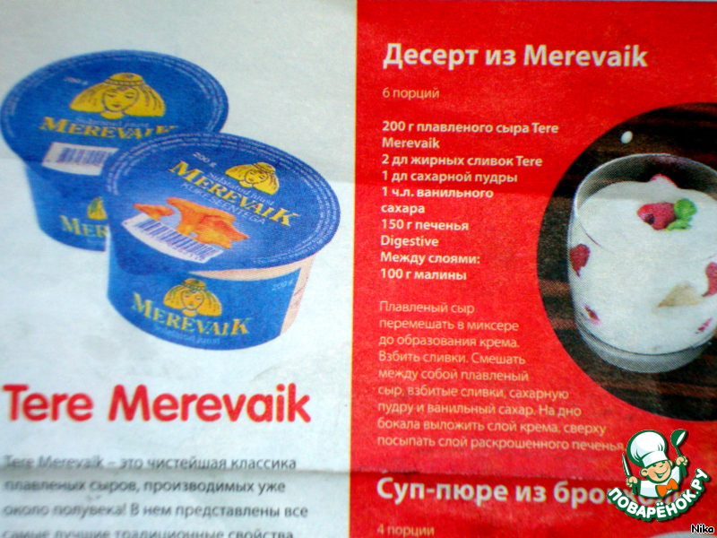 Вырезка из газеты, из которой я взяла идею с плавленным сырком. Я писала о том, что рецепт немного мною изменён. А именно, пропорции. Вместо печенья - вафли. Порций восемь.