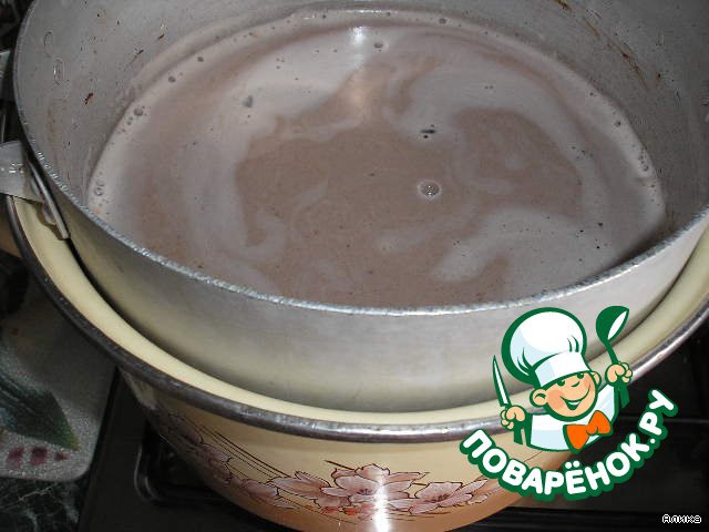 В широкую кастрюлю налить воды на высоту 3 см и довести воду до кипения, поставить на медленный огонь. Важно, чтобы маленькая кастрюля не касалась воды!