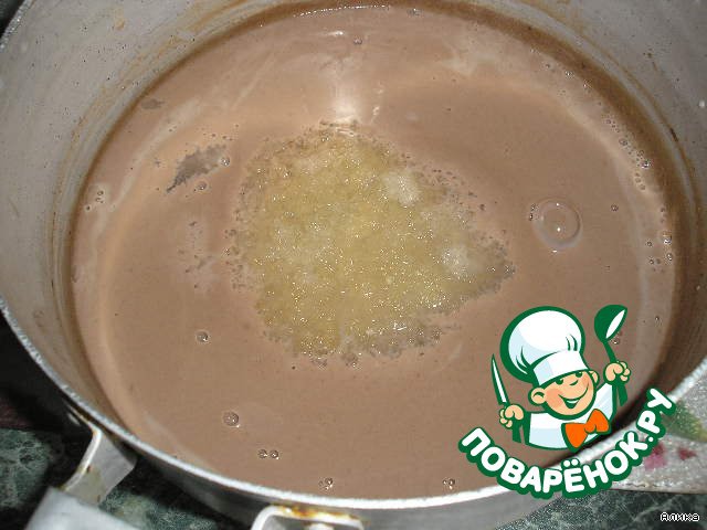 Снять с бани, остудить, чтобы смесь была теплая, но не горячая. Добавить желатин и хорошо перемешать до растворения желатина. Поставить в прохладную (не холодную!) воду на 5-10 минут.
