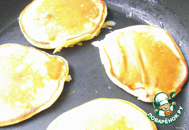 Смешать все ингредиенты для теста + изюм, заранее замоченный в роме. (Можно быстро "замариновать" изюм в микроволновой печи: его заливают ромом и ставят в печь, накрыв крышкой посуду на 2-3 мин). Выпечь на сковороде блинчики (легкие оладьи). Я пекла на небольшом огне под крышкой, тогда они быстрее поднимаются и пропекаются.