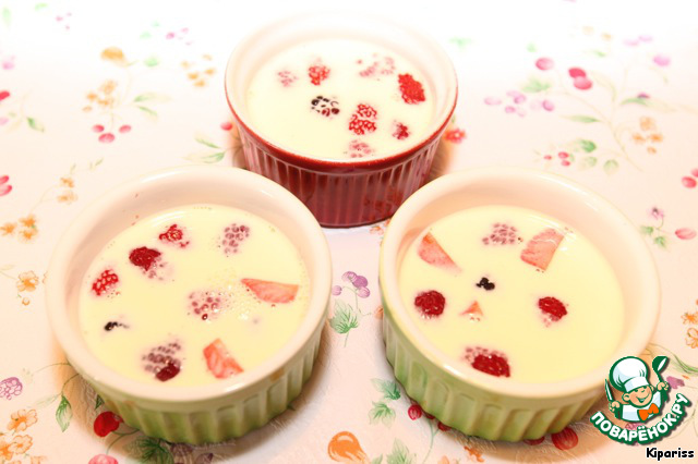 В молочно-сливочную смесь добавить яйца, все хорошо перемешать, процедить через сито и разлить по формам.