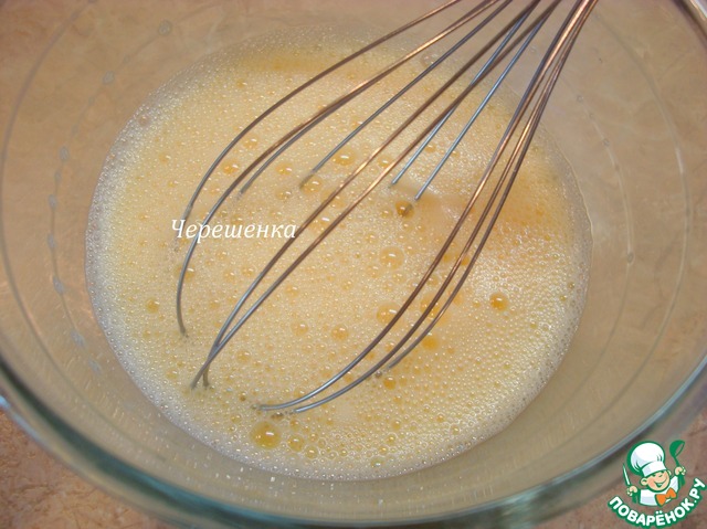 Взбить яйца с желтками и сахаром. Медленно влить теплое молоко с растворенным в нем желатином и еще раз хорошо взбить.