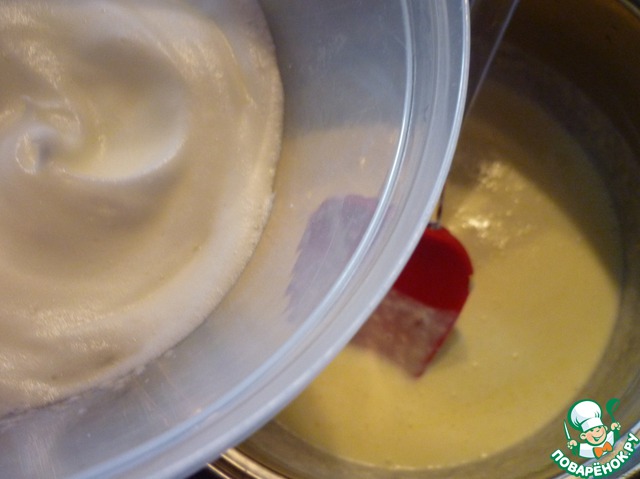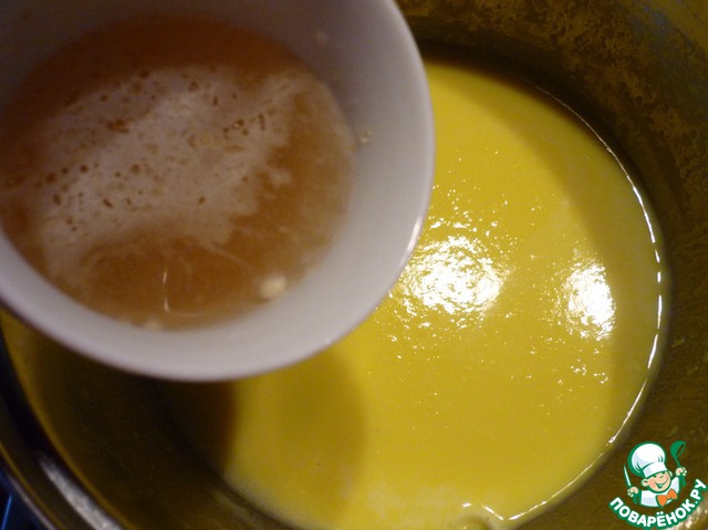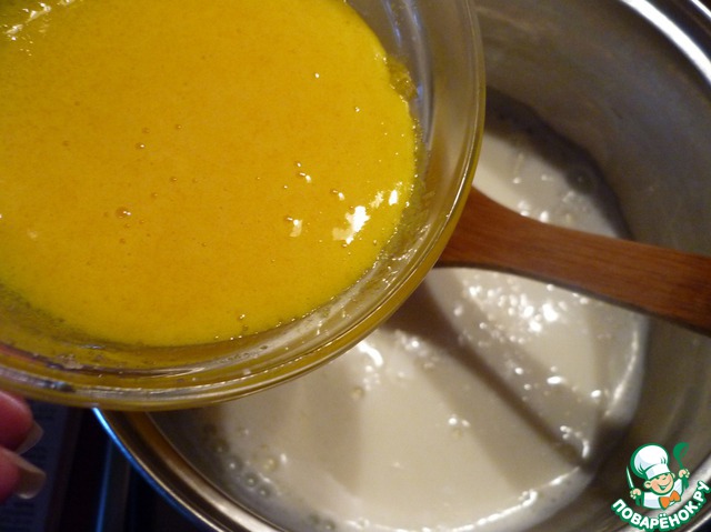 Молоко доведите до кипения, снимите с конфорки и введите, при помешивании, желтки в горячее молоко.