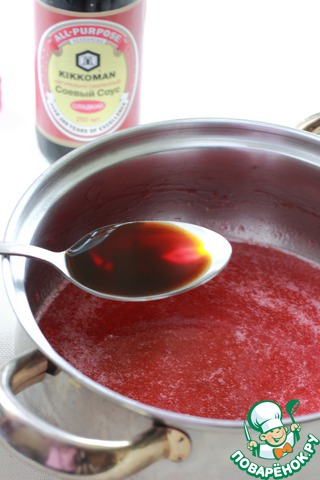 Добавьте к сиропу пюре из ягод и сладкий соевый соус. Вместо сладкого соуса можно использовать соус-маринад Терияки. В его составе также имеется сахар и он обладает сладковатым приятным привкусом. Часть теплого фруктового сиропа добавьте к отжатому желатину, перемешайте и влейте к ягодно-соевой массе.