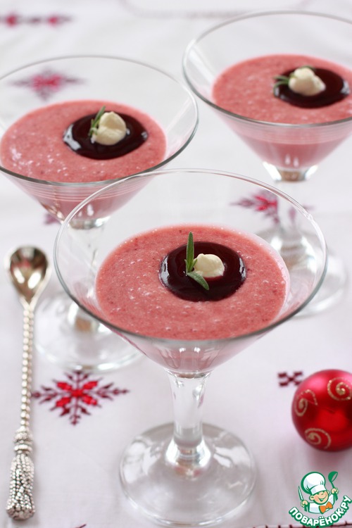 Разлейте крем по бокалам и уберите в холодное место. Через полчаса, когда крем достаточно загустеет, украсьте его малиновым соусом, который я приготовила из сиропа малинового конфитюра, пропустив его через мелкое сито. В каждую каплю малинового соуса положите немного сливок и листик мяты или розмарина.