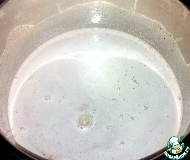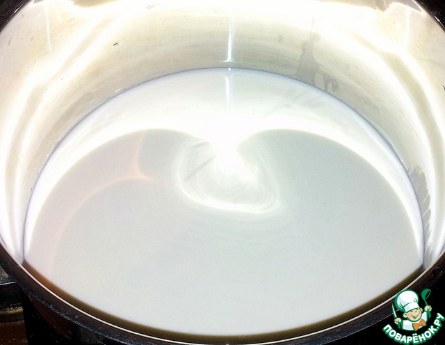 Молоко вылить в кастрюлю и довести его до кипения. Немного холодного молока оставить для крахмала.