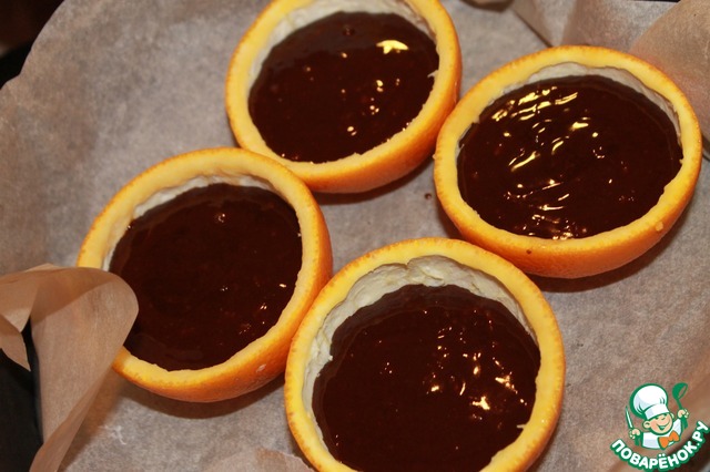 Выкладываем горячую массу в апельсиновые корзинки и ставим запекать в разогретую до 200 * С духовку на 15 минут.