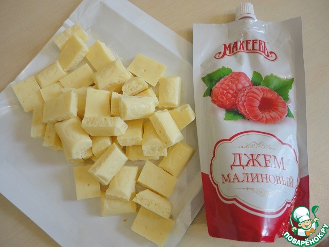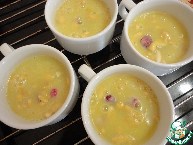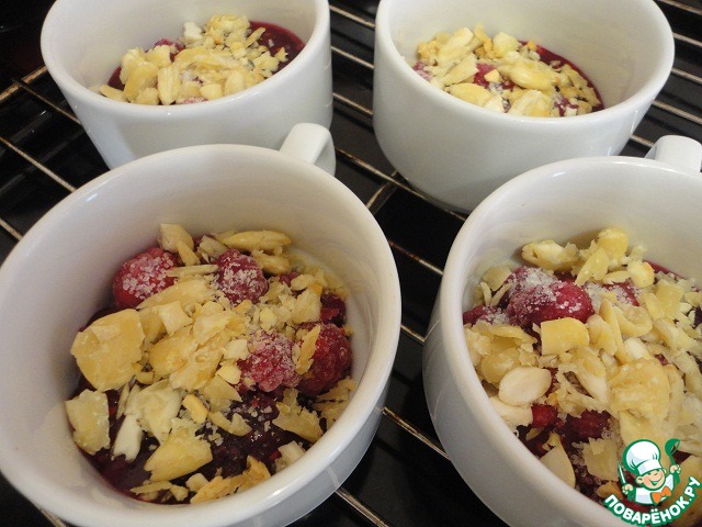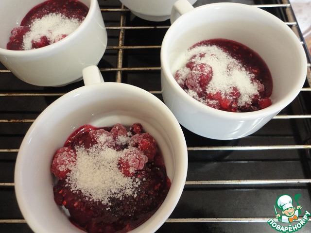 В жаропрочные формы распределить по 1 горсти малины, добавить малиновый джем по 1 ст. ложке.