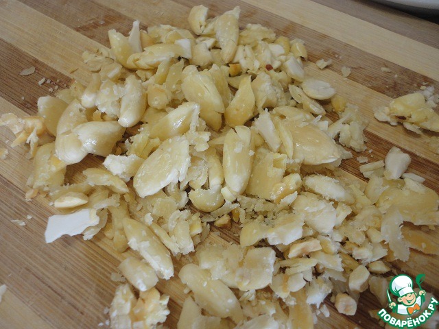 Миндаль растолочь. Нагреть духовку с грилем на 100%.