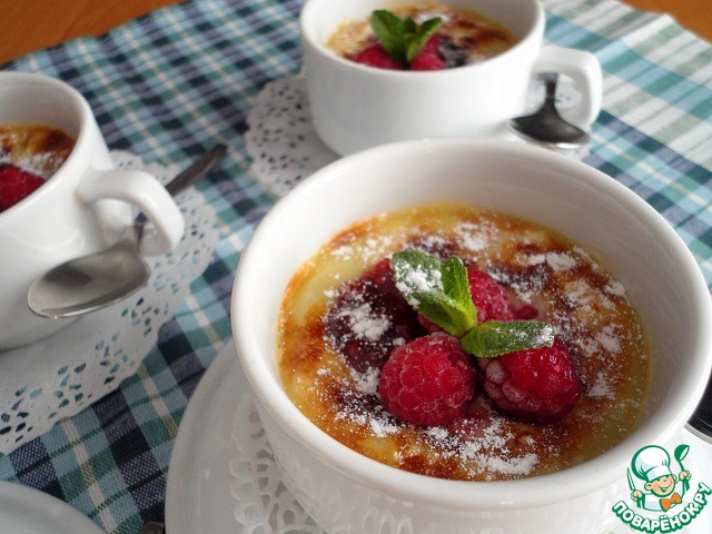 Поставить под гриль на 3 минуты, для образования коричневатой карамельной корочки. Достаём и начинаем украшать, по 1ч. л. малинового джема.