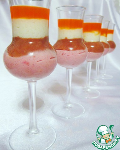 Также шоколад растопим на водяной бане, соединим с массой, укладываем в рюмки слоями, но лучше отсадить из кондитерского мешка, слоями, сверху налить апельсиновый сироп.